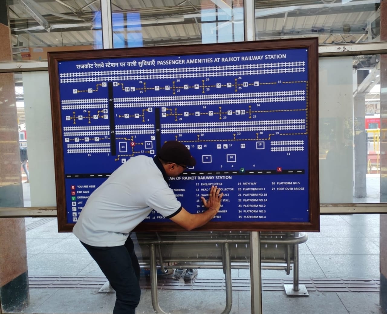 નવી વ્યવસ્થા અંતર્ગત રાજકોટ સ્ટેશનના મુખ્ય સ્થળો પર બ્રેઈલ લિપિમાં સાઈનેજ લગાવવામાં આવ્યા છે, જેનાથી દ્રષ્ટિહીન મુસાફરો પુરુષ શૌચાલય, મહિલા શૌચાલય, દિવ્યાંગજન શૌચાલય, પીવાનું પાણી, દિવ્યાંગજન રેમ્પ, લિફ્ટ, ફૂટ ઓવર બ્રિજ (પેદલ પાર પુલ), પૂછપરછ કાઉન્ટર અને પ્રતીક્ષાલય જેવી આવશ્યક સુવિધાઓ સુધી કોઈ પણ સહાય વિના સરળતાથી પહોંચી શકશે. આ સાથે જ બ્રેઈલ મેપ દ્વારા મુસાફરોને સ્ટેશનના સંપૂર્ણ લેઆઉટની સ્પષ્ટ જાણકારી પ્રાપ્ત થશે.